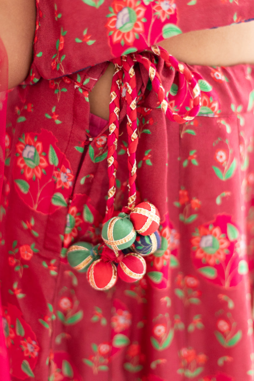 A STUNNING BLEND OF TRADITIONAL ELEGANCE AND CONTEMPORARY CHARM, THIS THREE-PIECE LEHENGA SET IS PERFECT FOR YOUR LITTLE PRINCESS'S FESTIVE CELEBRATIONS.THE ENSEMBLE FEATURES A VIBRANT RUBY RED BASE ADORNED WITH AN INTRICATE, ALL-OVER FLORAL MOTIF PRINT IN COMPLEMENTARY SHADES. THIS EXCLUSIVE PRINT ADDS A TOUCH OF PLAYFUL HERITAGE.