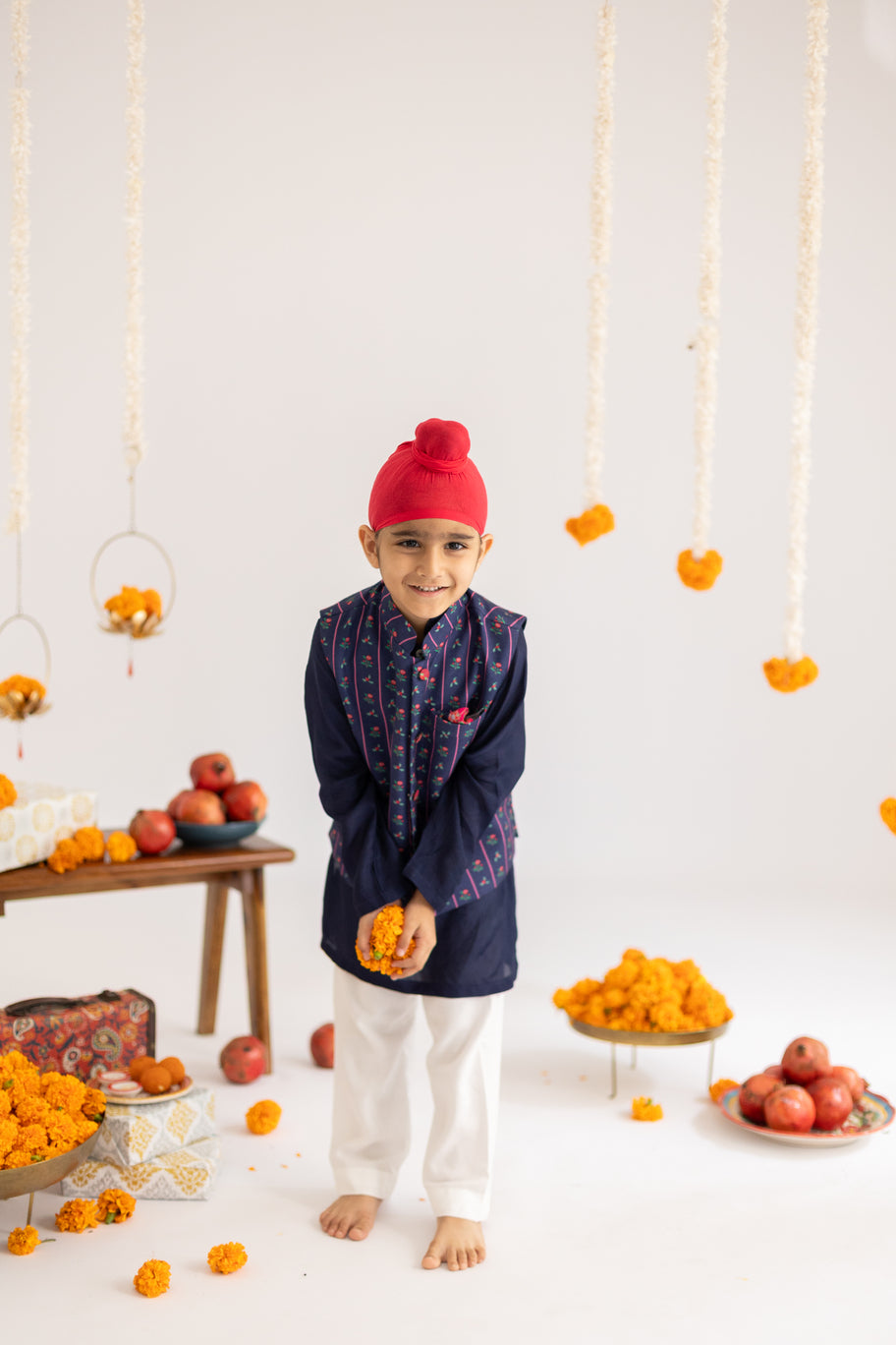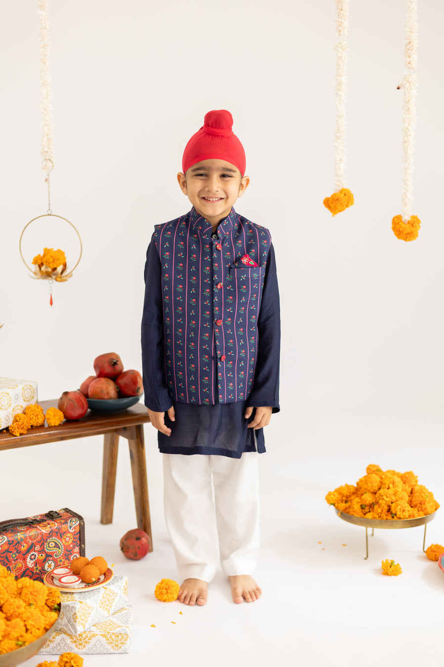 PERFECT FOR CELEBRATORY MOMENTS, THIS CLASSIC KURTA SET IS DESIGNED FOR COMFORT AND STYLE. THE CRISP SOLID COLOR KURTA AND PYJAMA PROVIDE A CLEAN BASE FOR THE EYE-CATCHING, FESTIVE PRINTED JACKET. IT FEATURES A SOFT MANDARIN COLLAR AND BUTTON-DOWN FRONT, ENSURING A SMART AND PROPER FIT.